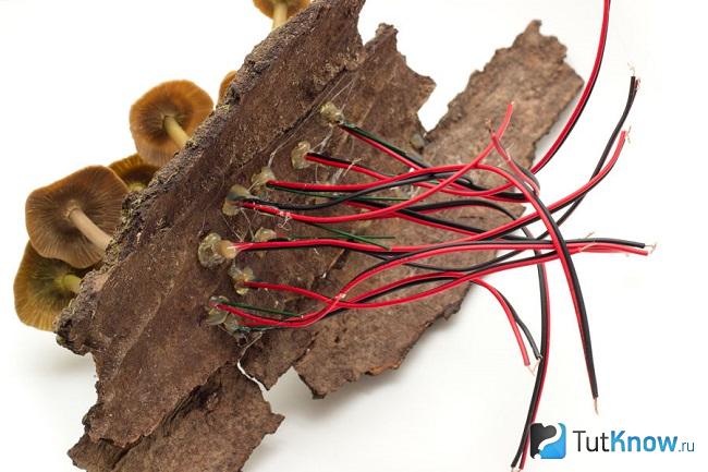 Изготовьте несколько таких грибов. Чтобы сделать светильник из коры дальше, начинайте создавать ножки грибов. Они будут с секретом, ведь именно тут спрятана электроника.